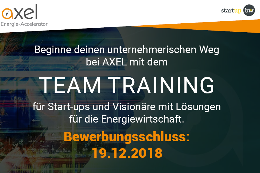 Noch bis zum 19. Dezember 2018 läuft die Bewerbungsphase für das Start-up-Programm des Start-up BW geförderten Energie-Accelerators AXEL: Team Training. Dieses Trainingsangebot eignet sich für Gründerteams, die eine zukunftsweisende Lösung für den Energiesektor haben und dazu ein ausgereiftes Geschäftsmodell entwickeln wollen. Das Team Training wird in der Technologiefabrik Karlsruhe durchgeführt und die Teilnahme ist für die Gründerteams kostenfrei!