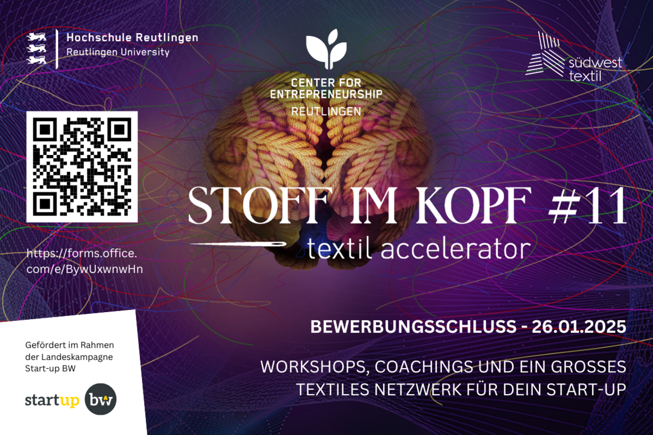 Das viermonatige Qualifizierungsprogramm unterstützt baden-württembergische Gründerinnen und Gründer sowie Start-ups bei der Entwicklung ihrer innovativen Geschäftsideen im textilen oder textil-digitalen Bereich. Die Teilnehmenden besuchen Workshops und Seminare zu den Schwerpunktthemen Digitalisierung, Smart Textiles und Fair Fashion sowie zur Vertiefung von gründungsrelevantem Wissen. Zusätzlich erhalten die Teilnehmenden individuelles Coaching und Mentoring sowie Zugang zu den textilen Laboren und Coworking Spaces der Hochschule Reutlingen.