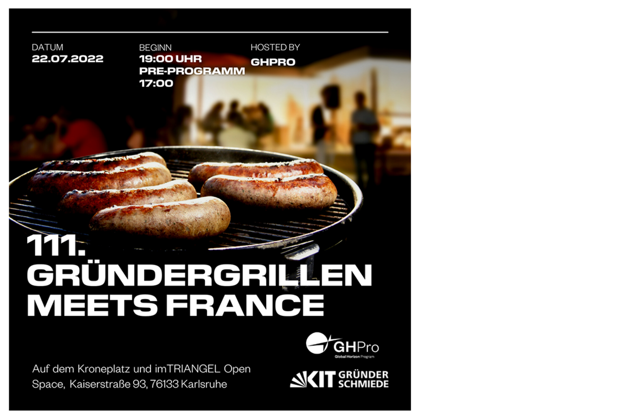 Interessierte können sich bis zum 15. Juli für die Veranstaltung anmelden. Eine Teilnahme ist kostenfrei möglich. Weitere Informationen bietet die Veranstaltungsseite: KIT-Gründerschmiede - 111. Gründergrillen meets France am 22. Juli