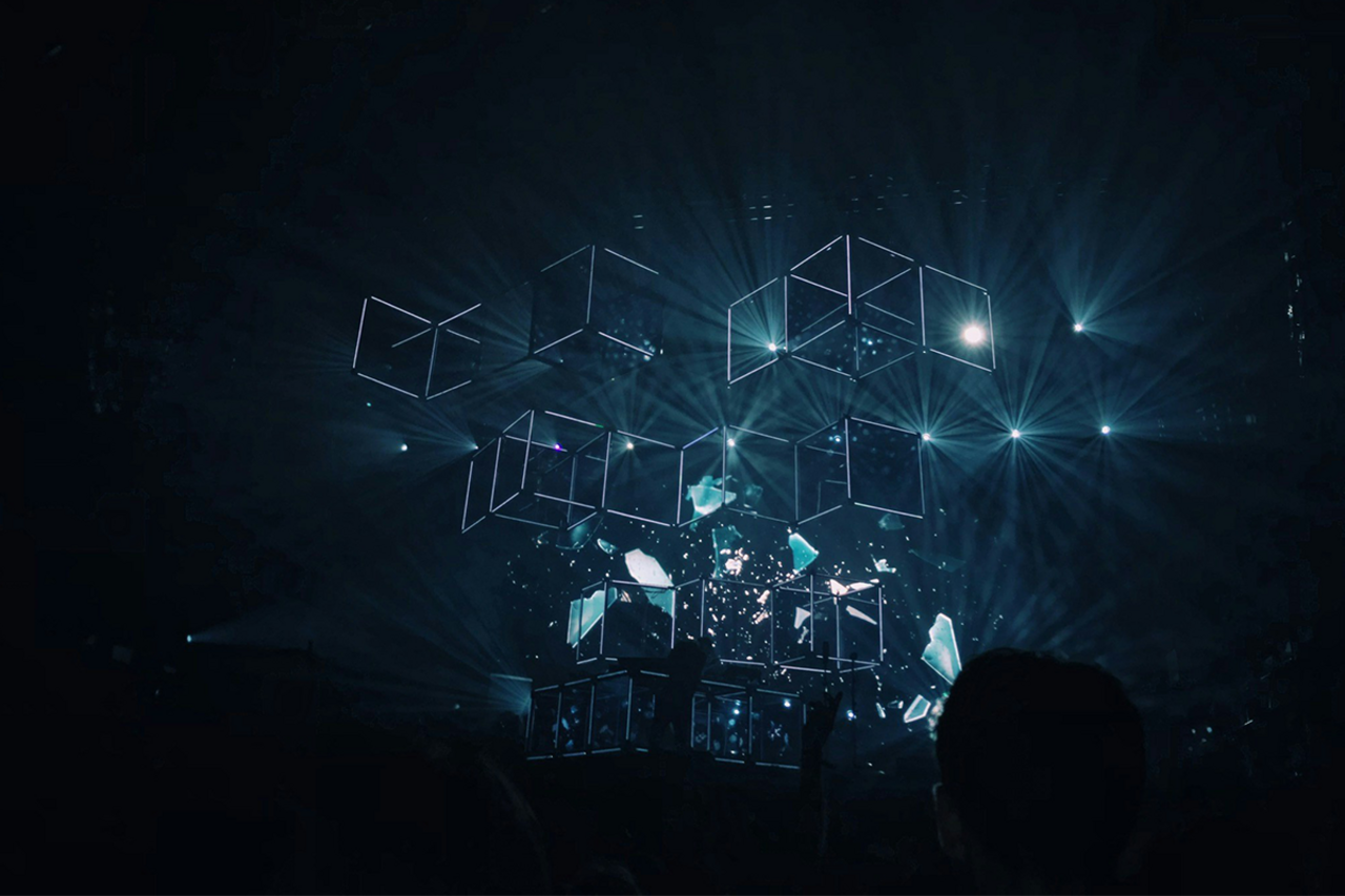 Eine Fotoaufnahme von einem Tech-Festival mit Laser-Show.