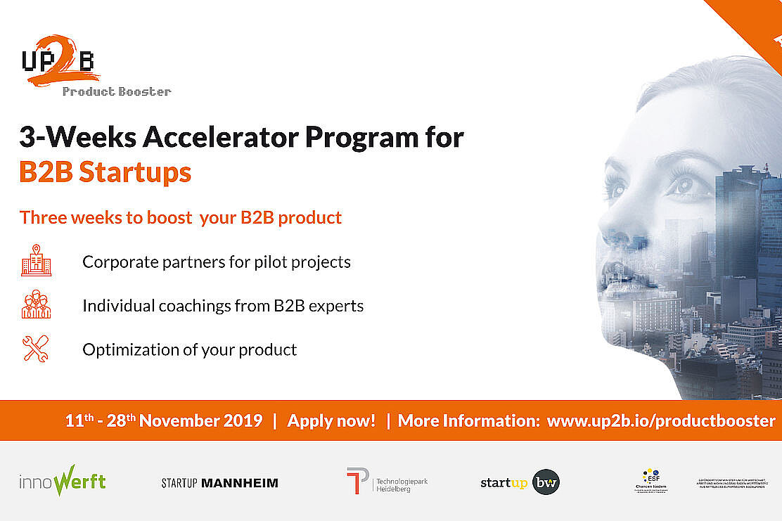 Vom 11.11.2019 – 28.11.2019 findet erneut das dreiwöchige Product Booster Programm des Start-up BW geförderten Up2B Accelerators statt. Zwölf B2B-Start-ups haben die Möglichkeit, innerhalb kürzester Zeit Pilotprojekte mit Unternehmen zu realisieren und mit Experten ihr Produkt zur Marktreife zu optimieren.