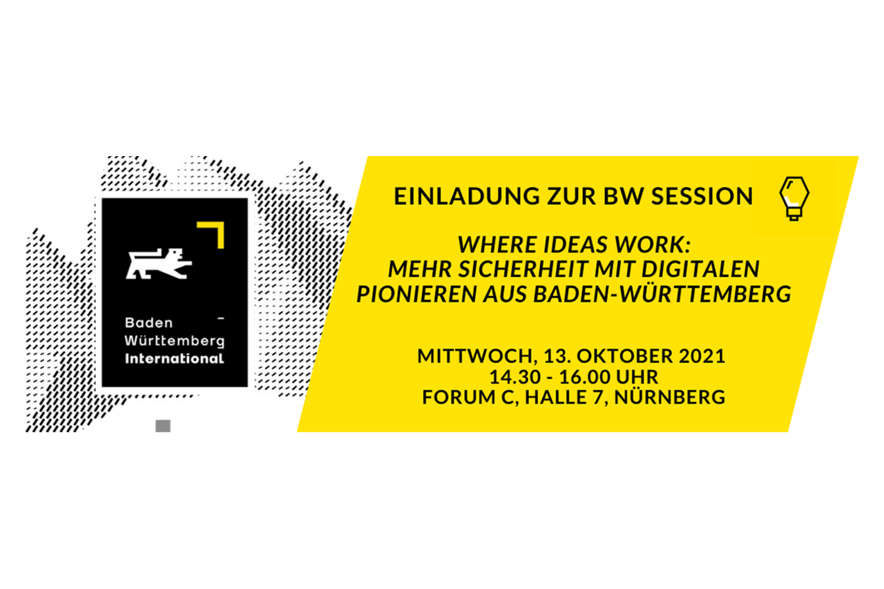Am 13. Oktober findet von 14:30 - 16:00 Uhr die Baden-Württemberg Session auf der IT-Security Messe it-sa 2021 in Nürnberg unter dem Motto: „Where ideas work: Mehr Sicherheit mit digitalen Pionieren aus Baden-Württemberg“ statt.