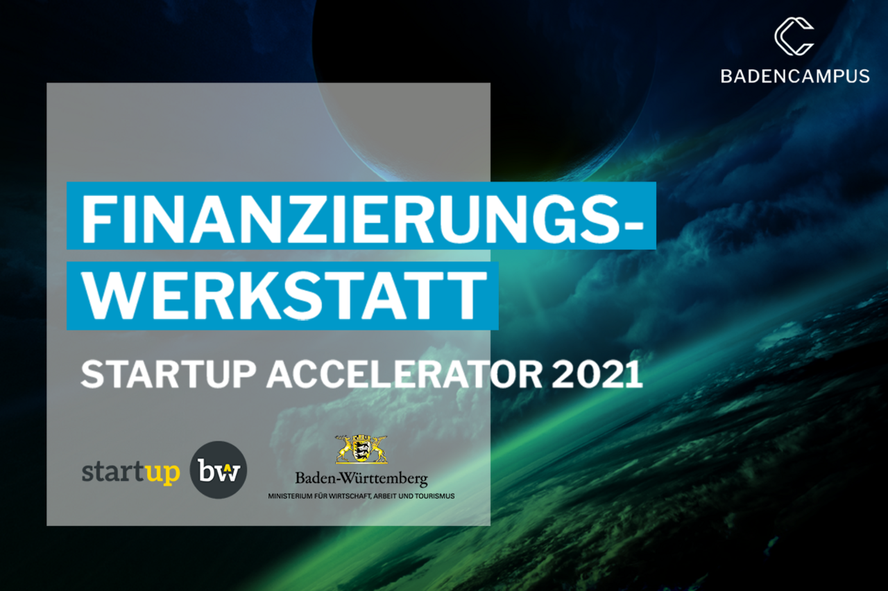 Flyer für die Bewerbungsphase der Finanzierungswerkstatt des BadenCampus Startup Accelerators 2021. Logos: Start-up BW, Ministerium für Wirtschaft, Arbeit und Tourismus Baden-Württemberg und BadenCampus.