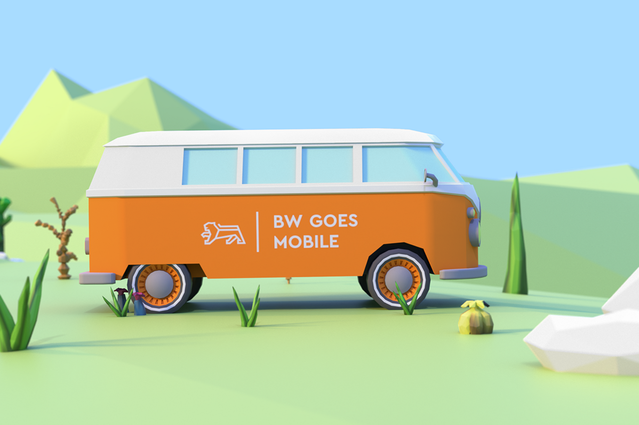 Die Zeichnung in Cartoon-Ansicht zeigt einen orangenen Bully mit der Aufschrift "BW Goes Mobile".