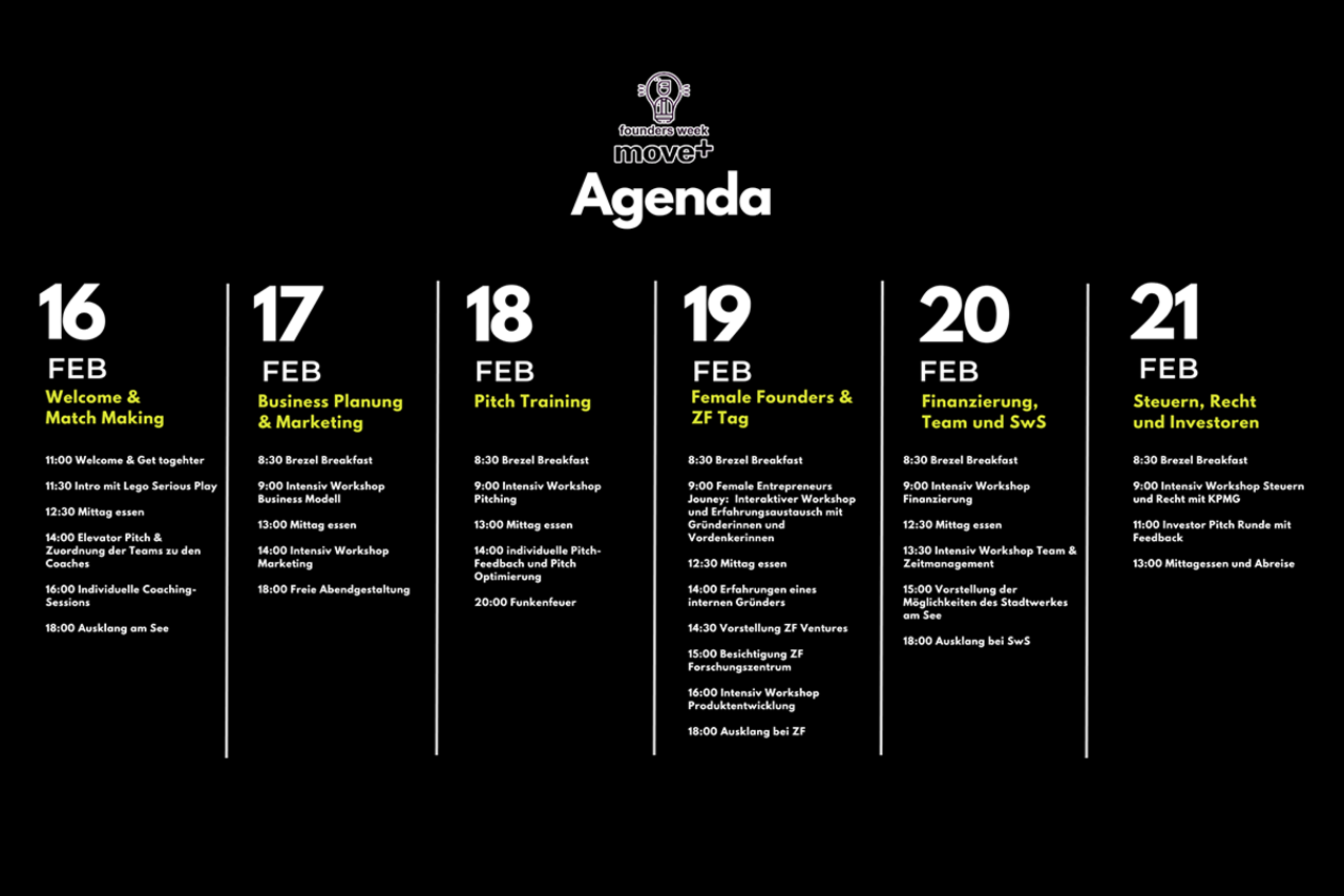 Im Rahmen der move+ founders week können die Teilnehmenden mit Unterstützung von Mentorinnen und Mentoren sowie Coaches ihre innovativen Geschäftsideen für den Mobilitäts- und Energiesektor weiterentwickeln. Zusätzlich stehen der Besuch von führenden Unternehmen in der Region sowie Treffen mit Investierenden auf dem Programm. Gleichzeitig bleibt den Teilnehmenden genug Zeit, um sich gegenseitig kennenzulernen und mit anderen Start-ups sowie mit Partnern des regionalen Ökosystems ins Gespräch zu kommen.