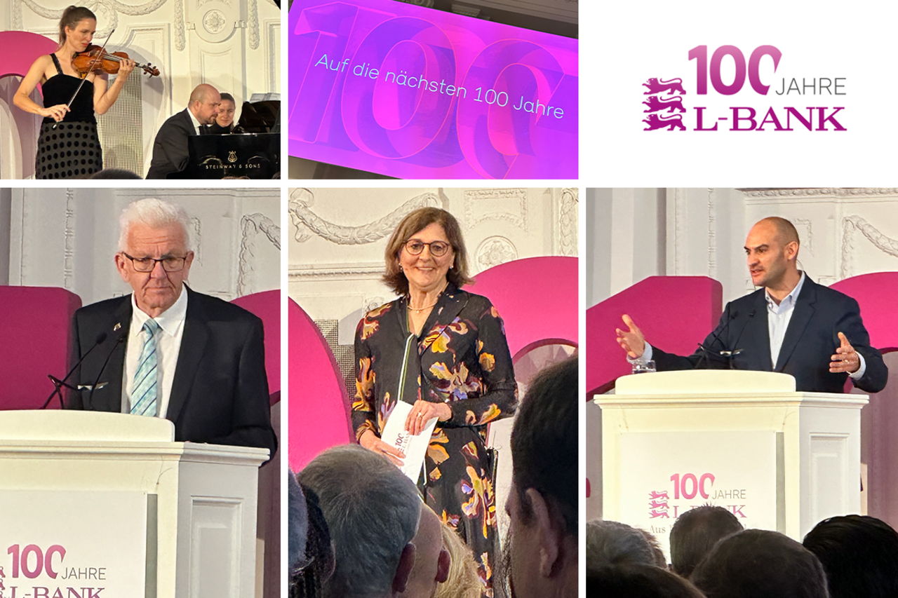 L‑Bank-Chefin Edith Weymayr blickte auf die lange Historie und wegweisende Entscheidungen bei einer der größten und erfolgreichsten Förderbanken Europas. Darüber hinaus richtete sie den Blick in die Zukunft und auf den Förderauftrag ihres Instituts: „Die Herausforderungen haben sich im Laufe des vergangenen Jahrhunderts immer wieder geändert – genauso wie die Antworten, die die Landesregierung mit uns als Förderdienstleister darauf gegeben hat. Aber das Ziel unserer Arbeit ist doch stets dasselbe geblieben: Investitionen ermöglichen und Zukunft gestalten. Unternehmen, Kommunen und Familien können sich seit 100 Jahren darauf verlassen, dass wir dieses Ziel fest im Blick haben – auch in Zukunft. Das ist unser Auftrag. Daran arbeiten wir mit ambitionierten Zielen und Entschlossenheit.“