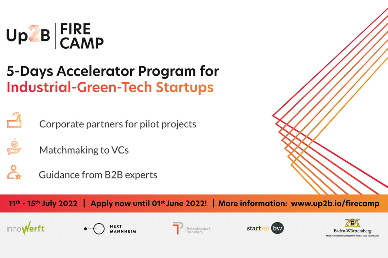 Bewerbungen für eine Teilnahme sind bis zum 1. Juni 2022 möglich. Weitere Informationen zum Up2B Accelerator, dem FIRECAMP 2022 und die Möglichkeit zur Bewerbung finden Sie unter www.up2b.io/firecamp.