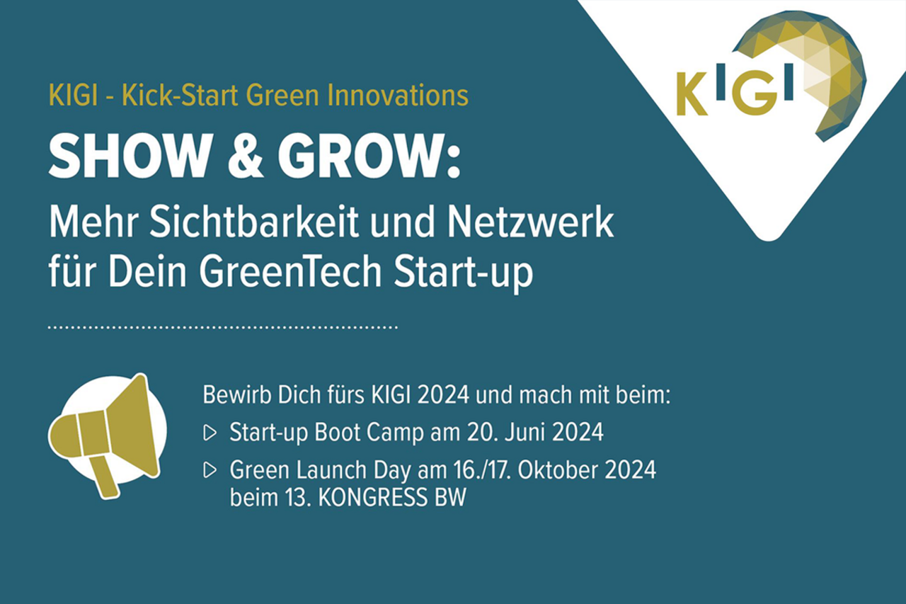 Die zweiteilige Veranstaltung KIGI - Kick-Start Green Innovations bietet GreenTech Start-ups die Möglichkeit, ihre Geschäftsideen in einem Start-up Boot Camp durch gezieltes Coaching weiterzuentwickeln. Im zweiten Teil, beim sogenannten Green Launch Day, können die teilnehmenden Teams ihre ausgearbeiteten Geschäftsideen, Investorinnen und Investoren sowie Branchenvertreterinnen und -vertretern vorstellen. Der Green Launch Day findet im Rahmen des 13. KONGRESS BW am 16. und 17. Oktober 2024 in Heidelberg statt. Die besten Start-up Pitches werden dabei von einer Fachjury ausgezeichnet und erhalten Preise. Darüber hinaus haben die teilnehmenden Start-ups in der begleitenden Ausstellung im Netzwerkbereich die Gelegenheit, ihre Prototypen und Industrial Needs Steckbriefe zu präsentieren sowie Technologiegespräche mit den Gästen zu führen.