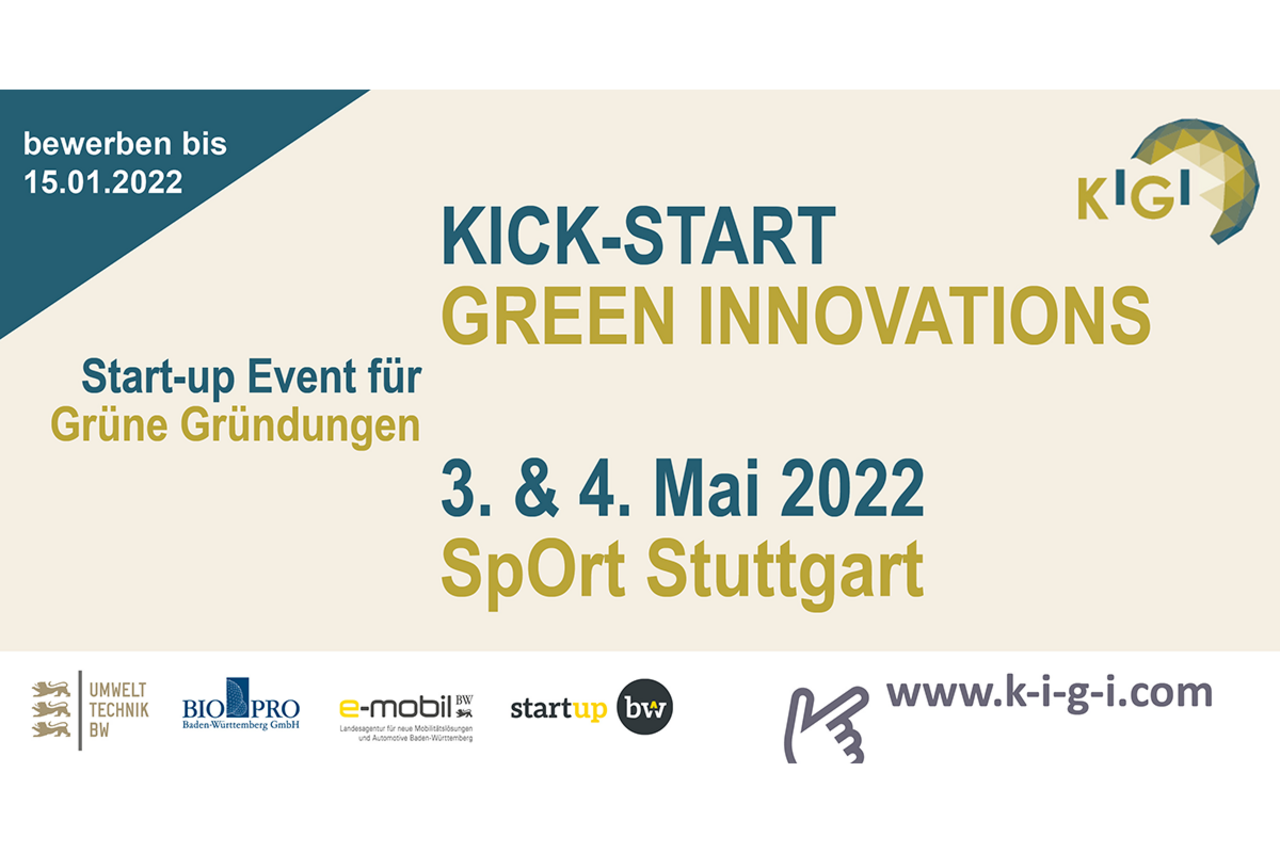 Das “KIGI - Kickstart Green Innovations” wird veranstaltet von Umwelttechnik BW, der Landesagentur für Umwelttechnik und Ressourceneffizienz Baden-Württemberg, mit Unterstützung durch die Landeskampagne Start-up BW des Wirtschaftsministeriums Baden-Württemberg.