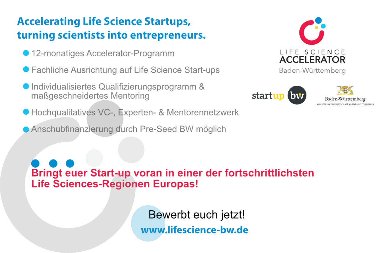 Bewerbungen werden bis zum 15. September entgegen genommen. Weitere Informationen finden Sie unter www.lifescience-bw.de.