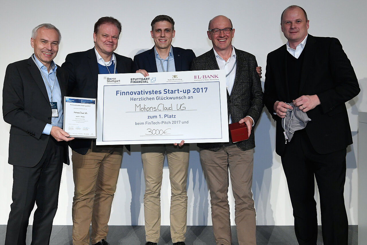 Das Rennen um den Titel als „Finnovativstes Start-up 2017“ machte die MotionsCloud UG. Das FinTech vereinfacht die Schadensmeldung an Versicherungen. Dem jungen Unternehmen gelang es, beim FinTech-Pitch eine hochkarätige Jury aus Experten der Finanz- und Investorenszene von seinem Geschäftsmodell zu überzeugen und sich damit unter den acht vorher ausgewählten Finalisten durchzusetzen. Als Siegergeld gab es 3.000 Euro. Doch damit nicht genug: Zusätzlich erhält MotionsCloud eine von insgesamt vier Wildcards für einen exklusiven Pitch beim Finanzplatzgipfel 2018, dem Spitzentreffen der baden-württembergischen Real- und Finanzwirtschaft im Neuen Schloss in Stuttgart. Den zweiten Platz und 2.000 Euro sicherte sich die FinCompare GmbH, der dritte Platz und 1.000 Euro ging an die Elinvar GmbH.