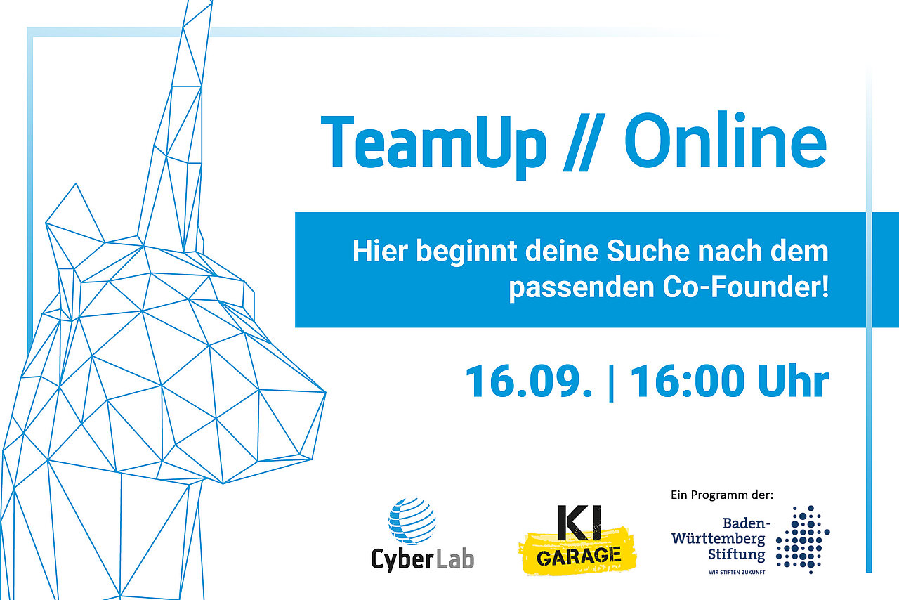 Die Suche nach einer Mitgründerin oder einem Mitgründer beginnt damit, Kontakte zu knüpfen und offen zu sein, neue Menschen kennenzulernen, die ähnliche Interessen und Ziele haben. Das CyberLab unterstützt mit TeamUp die Suche nach geeigneten Teammitgliedern. Die nächste Ausgabe des Veranstaltungsformats findet am 16. September 2021 in Kooperation mit der KI Garage statt und legt den Fokus auf Gründungsideen rund um das Thema Künstliche Intelligenz.