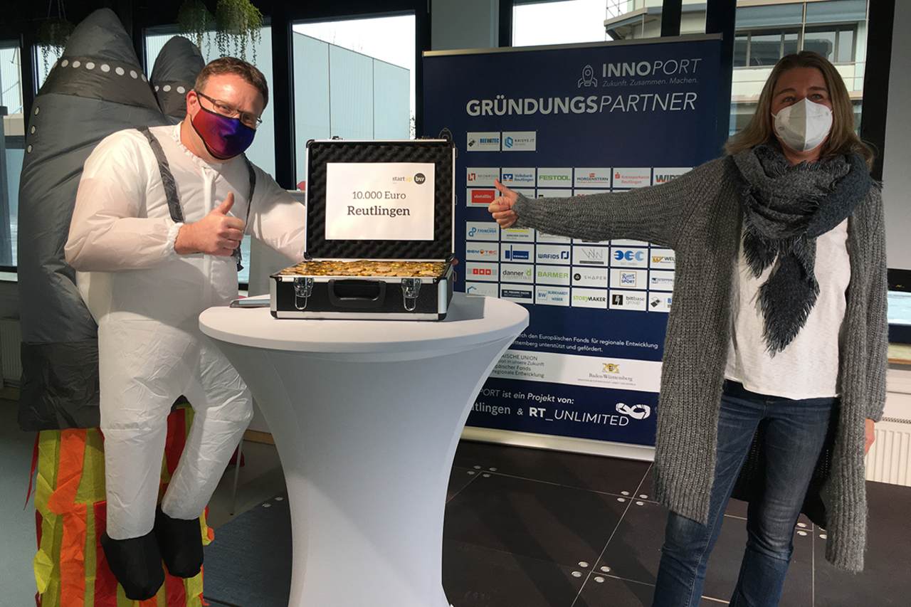 „Rakete“ Flammer lacht und freut sich über die Trophäe für den Sieg im Landesfinale bei Start-up BW Local, einen symbolischen Geldkoffer, den ich im Auftrag des Veranstalters übergeben darf. „Das Geld ist schon auf dem Konto. Wir werden es natürlich für Aktionen hier im Innoport einsetzen. Jetzt hoffen wir, dass die Pandemiesituation es zulässt, bald auch Aktionen mit Publikum hier vor Ort starten zu können.