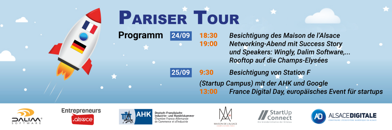 Der von Entrepreneurs Alsace organisierte Aufenthalt bietet die Möglichkeit, ein spezielles Programm mit mehreren Partnern zu nutzen: StartUp.Connect Ortenau, Alsace Digitale, Dalim GmbH, das Maison de l'Alsace und die Deutsch-Französische Handelskammer in Paris.