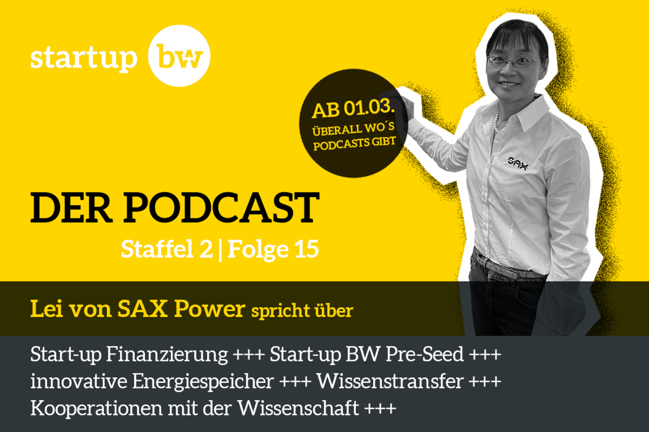 Am kommenden Mittwoch geht die nächste Folge der zweiten Staffel des Start-up BW Podcasts online. Wir sprechen mit Lei Shen, der Gründerin von SAX Power.