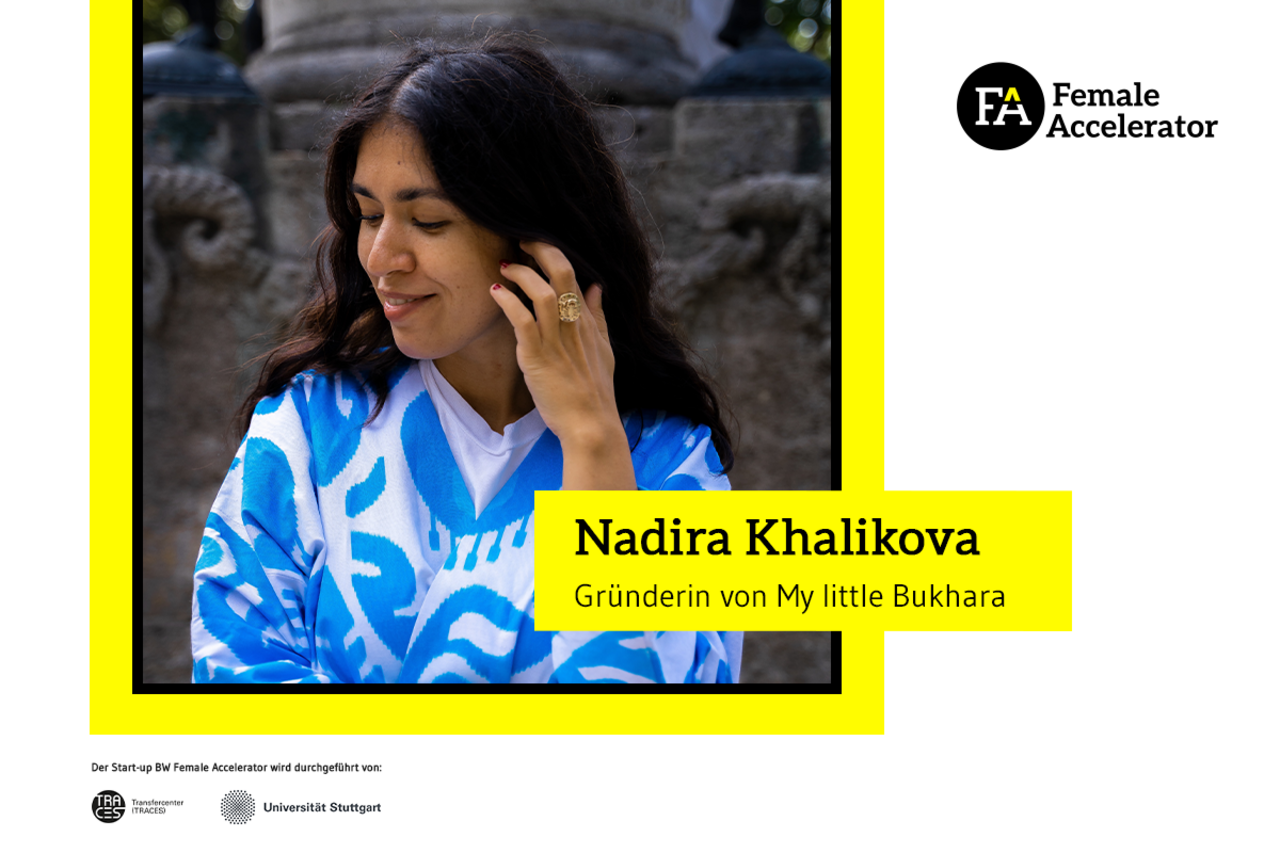 Die oftmals stark benachteiligte Lebenssituation der Frauen in Usbekistan war der ausschlaggebende Grund für Nadira, ihr Start-up My little Bukhara zu gründen und diese Frauen auf ihrem eigenen Weg zu stärken. Für diesen Ansatz erhielt Nadira bereits mehrere Auszeichnungen, darunter den Sozialpreis der Stadt Böblingen und die Möglichkeit, ihre Mode auf dem Laufsteg während der Berlin Fashion Week 2022 zu präsentieren.