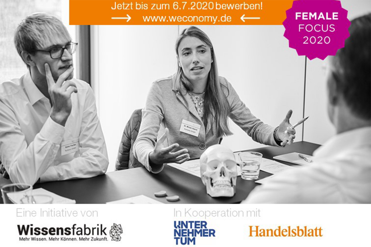 Seit über zehn Jahren veranstaltet die Wissensfabrik – Unternehmen für Deutschland e.V. in Zusammenarbeit mit UnternehmerTUM und Handelsblatt den WECOMOMY-Grundungswettebwerb. Die Veranstalter vernetzen im Rahmen des Wettbewerbs Start-ups mit etablierten Unternehmen. Die erfolgreichen Teams werden ein Jahr lang betreut und nehmen an einem Programm mit Speedmentorings und Diskussionen mit erfahrenen Fach- und Führungskräften teil. In diesem Jahr wird der Wettbewerb unter dem Motto "Female Focus 2020" ausgetragen. Teilnehmen können innovative, technologieorientierte Start-ups, die nicht älter als 5 Jahre sind, ihren Hauptsitz in Deutschland und mindestens eine Frau im Gründungsteam haben. Weitere Informationen und die Möglichkeit zur Bewerbung finden Sie unter www.weconomy.de.